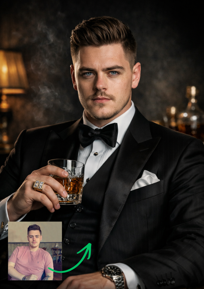 The sharp tuxedo lines, crisp bow tie, polished watch, and subtle gold detailing create a refined contrast between sophistication and dominance. Every highlight and shadow is crafted to deliver depth, realism, and a high-end editorial finish — the kind you’d expect from a premium film poster or private gallery piece.
